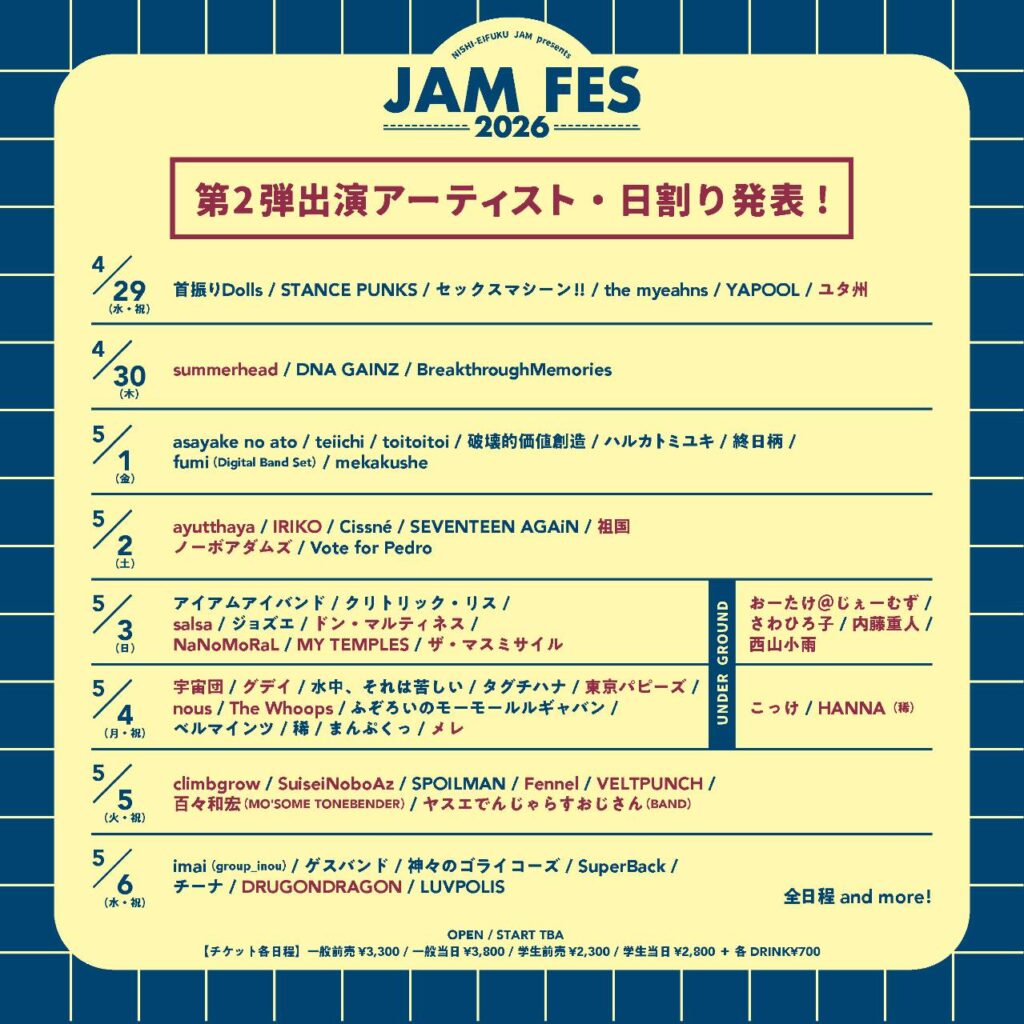5月5日(火・祝)西永福JAM「JAM FES 2026」開演未定 前売り3,300円(D別)